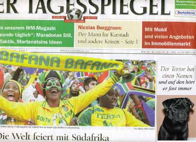 Terror feiert mit Südafrika den Beginn der Fussball - WM 2010 und weiß wie er heißt. Schlagzeile im Berliner Tagesspiegel am 12.06.2010 (Bitte auf das Bild klicken zum Vergrößern)